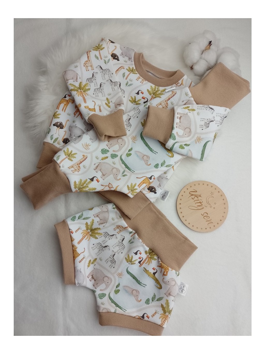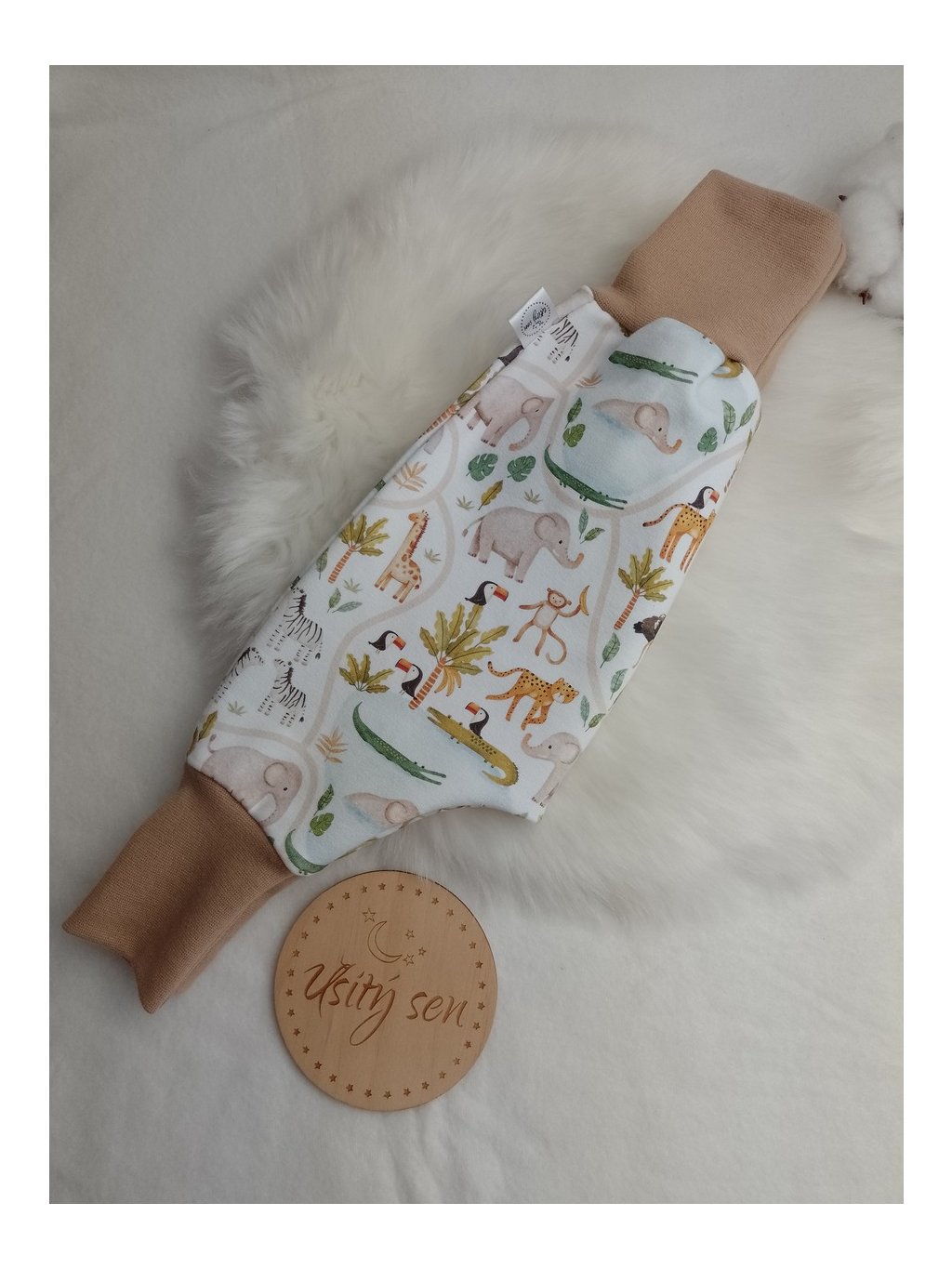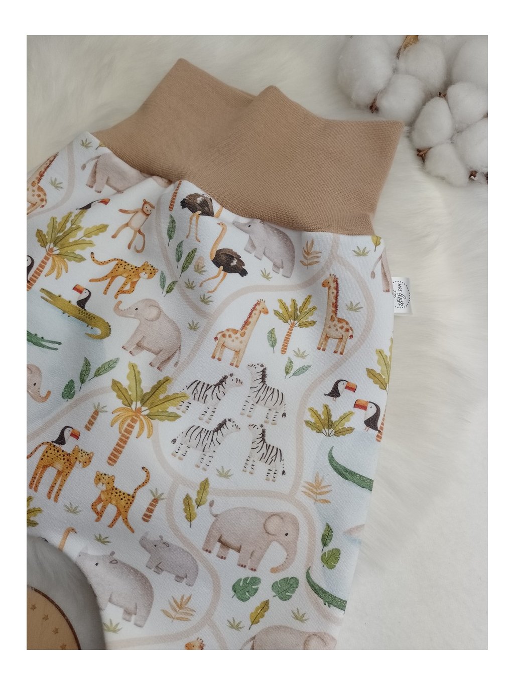 Baggy tepláčky s autorským vzorem safari zvířátek jsou nutností každého miminkovského šatníku. Pohodlný a jednoduchý střih. Jsou ušity z jemné a prémiové BIO teplákoviny ve složení 95% biobavlna a 5% elastan. V pase není guma, miminko tak nic netlačí. Tepláčky jsou vhodné pro miminka s látkovou i jednorázovou plenkou. Díky sníženému kulatému sedu perfektně padnou na každý zadeček a dopřejí volnost v pohybu :-)
