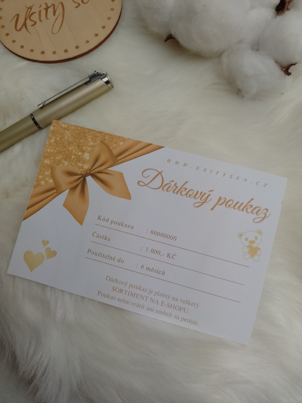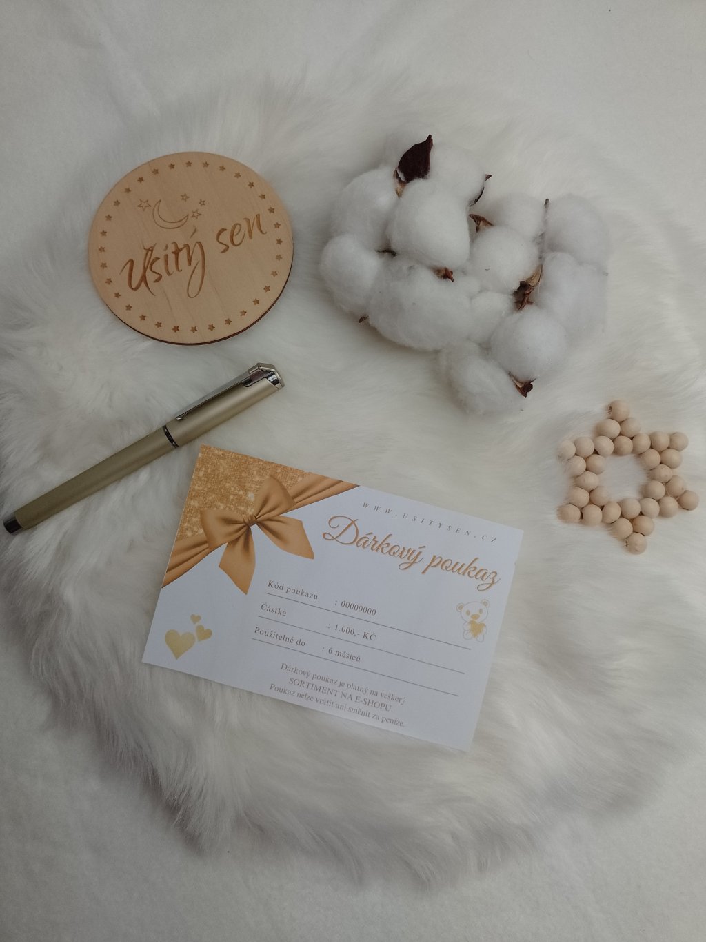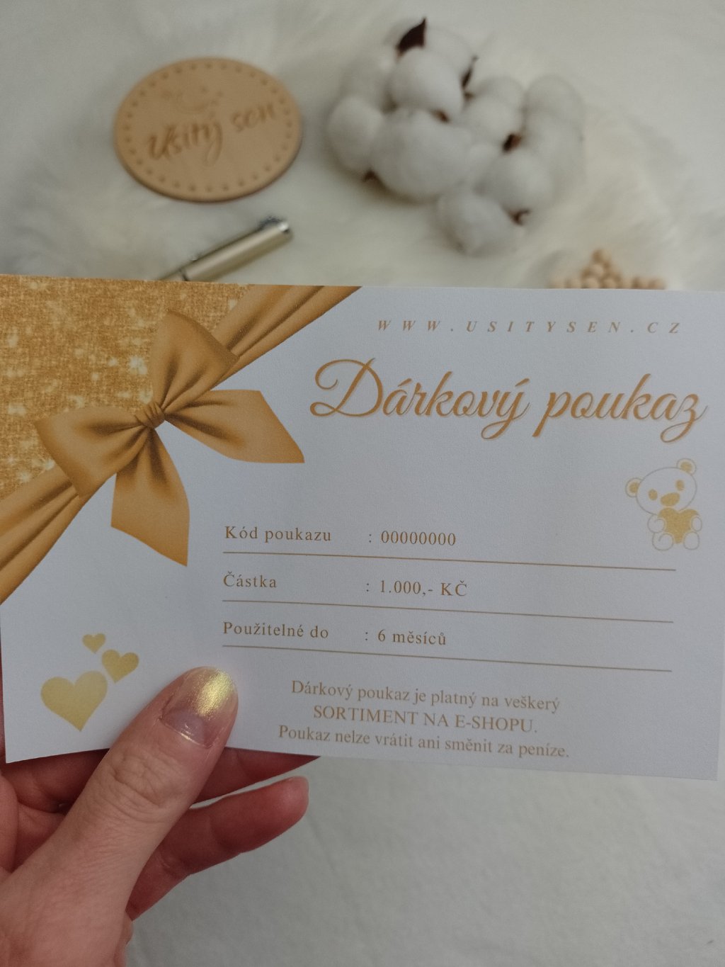 Nevíte si rady, jaký produkt z nabídky potěší maminku a její děťátko nejvíce? Dárkový tištěný poukaz v dárkové obálce je skvělou volbou, jak zaručeně udělat radost. Obdarovaná maminka si tak vytvoří objednávku dle svého gusta. Dárkový poukaz lze zakoupit ve výši 500,- Kč, 1.000,- Kč, 1.500,- Kč a 2.000,- Kč.