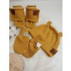 Novorozenecký set obsahuje čepičku, capáčky a kojenecké rukavičky. Capáčky jsou ušité s vnitřní fleecovou vložkou ze 100% bavlny a nožičky tak krásně zahřejí. Rukavičky ochrání miminko před poškrábáním.