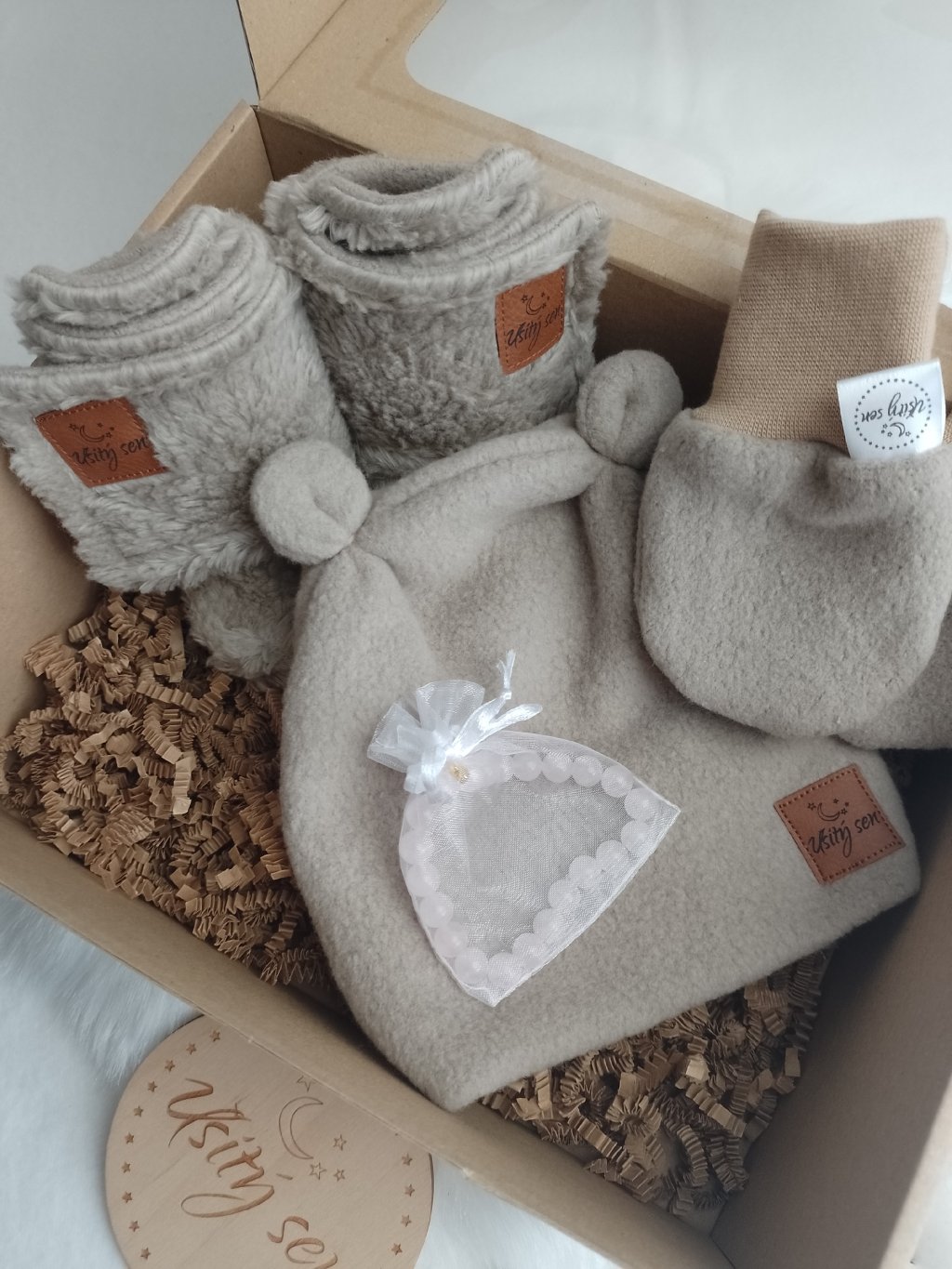 Krásný novorozenecký zimní dárkový set pro miminko , který obsahuje capáčky ( vel. 0-3 měsíce ),tu nejmenší čepičku vhodnou pro novorozence ve vel. 34-36 cm a praktické kojenecké rukavičky. A navíc jako bonus ZDARMA minerální růženínový náramek. Růženín je kamenem lásky. Otevírá srdce a smysly všem krásným věcem. Velikost korálků je 8 mm. Náramek je pro obvod ruky 16-18 cm.